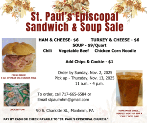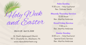 For over a century, St. Paul’s Episcopal Church in Manheim has been a community of faith where, in our diversity, we hold each person to be a child of God with unique gifts and talents. We seek to follow Christ, share His grace, and serve our community.