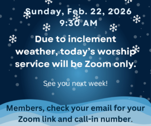 Weekly Sunday worship begins at 9:30 a.m. in person and on Zoom.